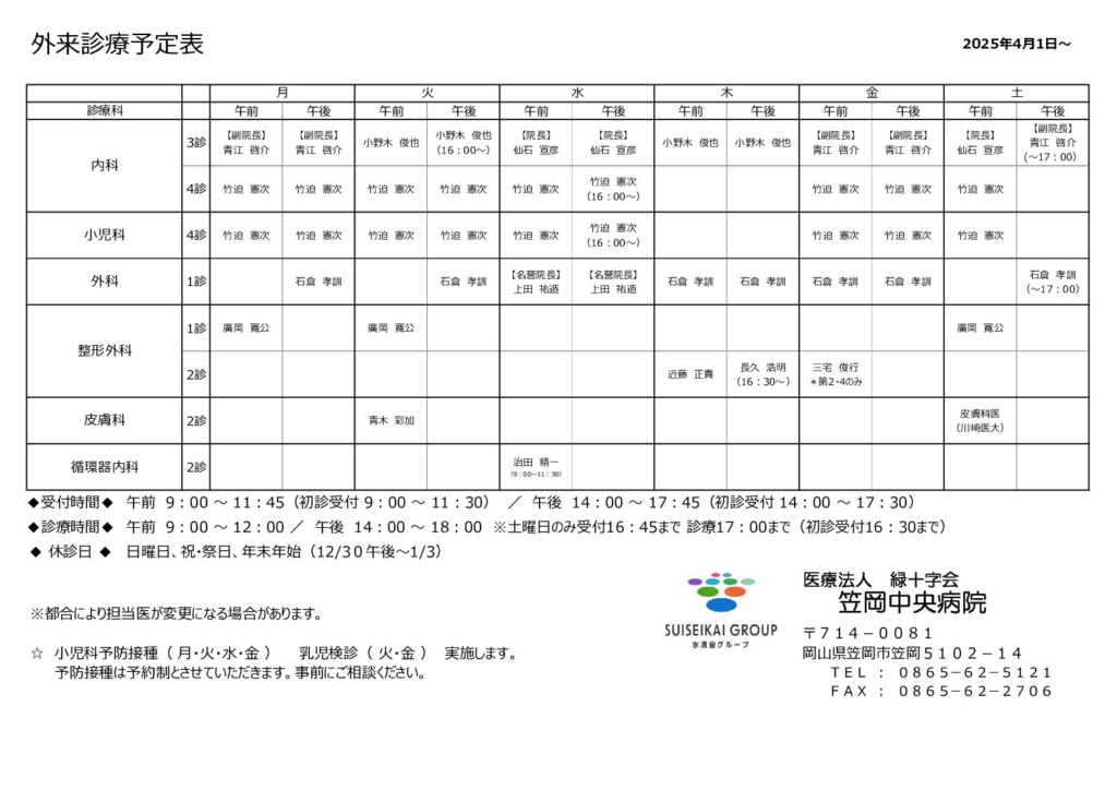 当院では下記のとおり外来診療を行っております。〈令和7年4月1日 現在〉