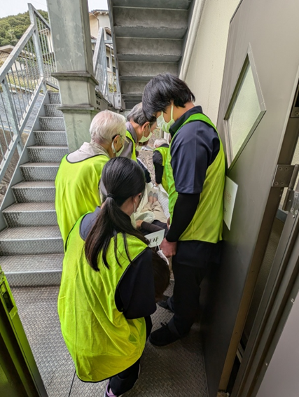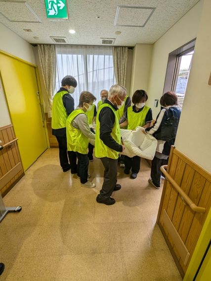 訓練中、消火器の使用方法、車椅子での移動や屋外階段の移動などを通して、消防署の方から改めて実践的なご指導をいただきました。また地域の方からは、どのように動いたら良いのか、わかりにくかったというご指摘がありました。