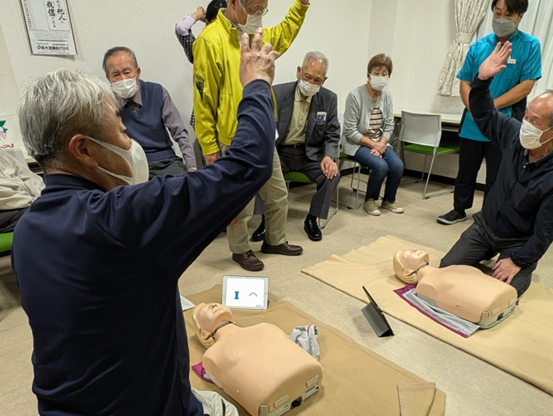また、訓練後に笠岡消防署のご指導のもと、心肺蘇生法・AEDの体験をしました。