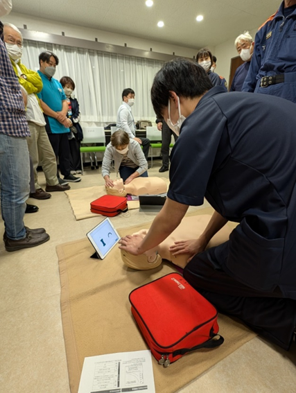 心肺蘇生の出来栄えが点数化される最新の機種を使い、正確に実施することができました。殆どの方が初体験で、真剣に取り組まれていました。