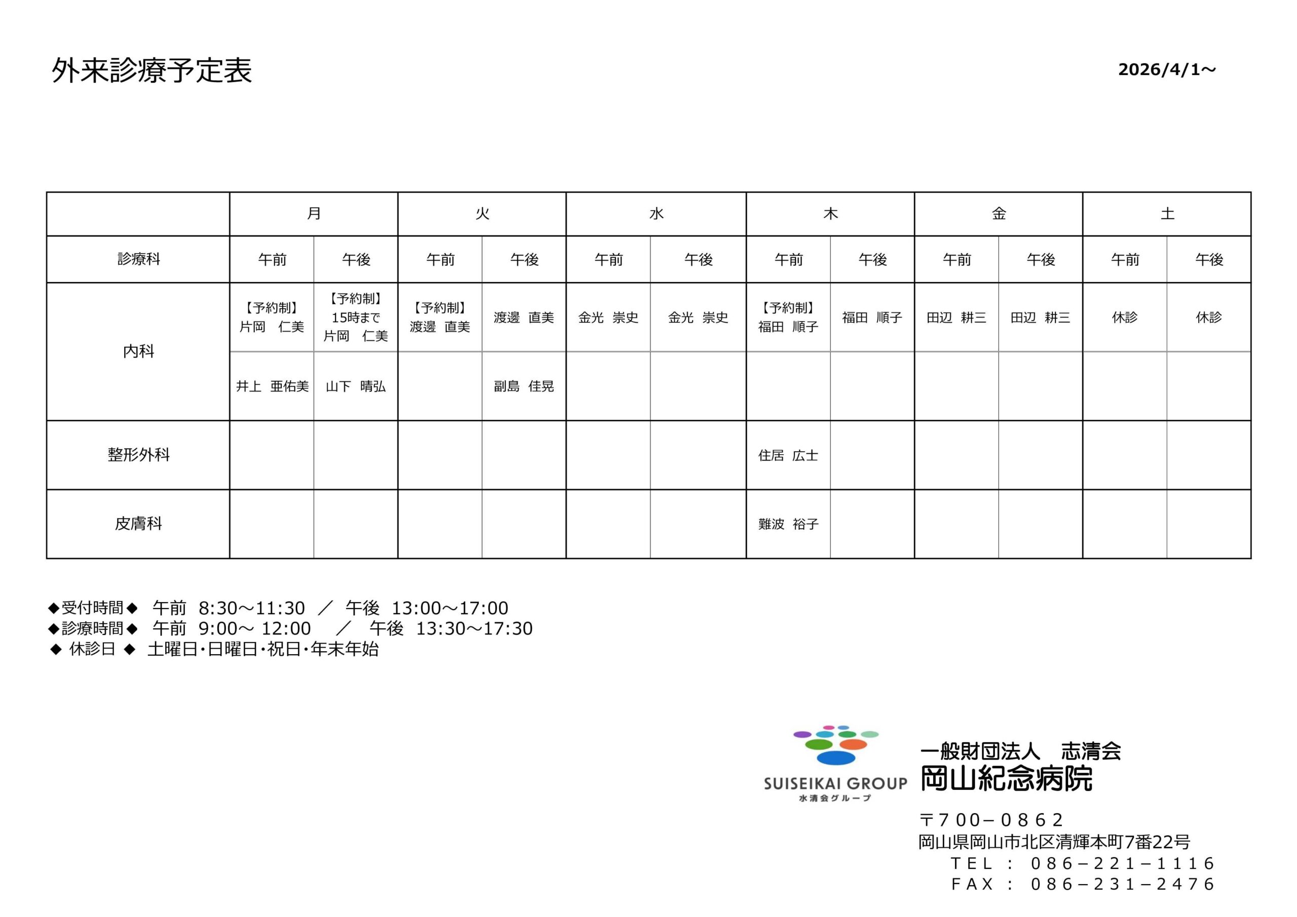 HOME > お知らせ >外来診療予定表変更のお知らせ(令和8年4月~)