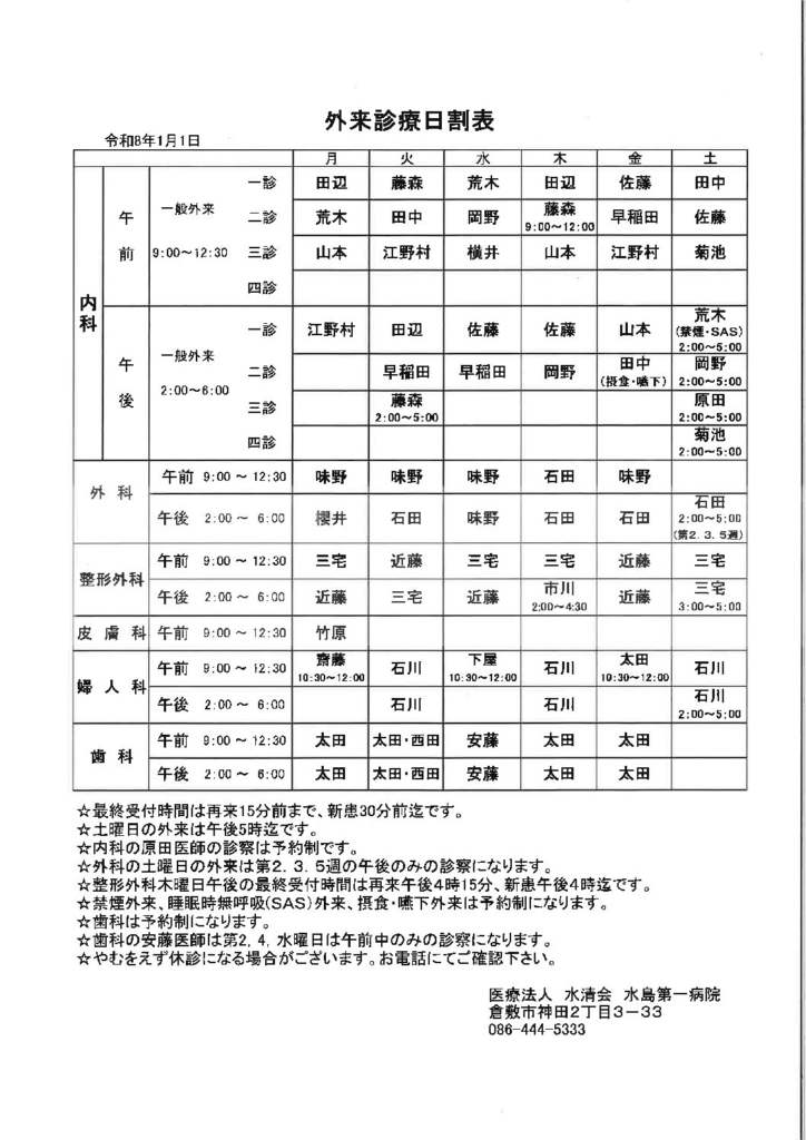 当院では下記のとおり外来診療を行っております。〈令和7年8月1日 現在〉